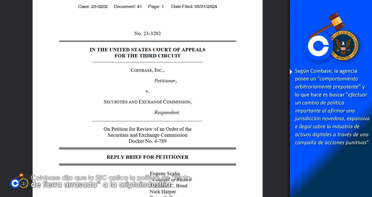 Por su parte, Paul Grewal, director legal de Coinbase, a través de un breve hilo en la red social X, informó lo que significa este documento presentado en la Corte. “Hoy presentamos nuestro escrito final en el Tercer Circuito impugnando la denegación por parte de la SEC de nuestra petición de reglamentación”.