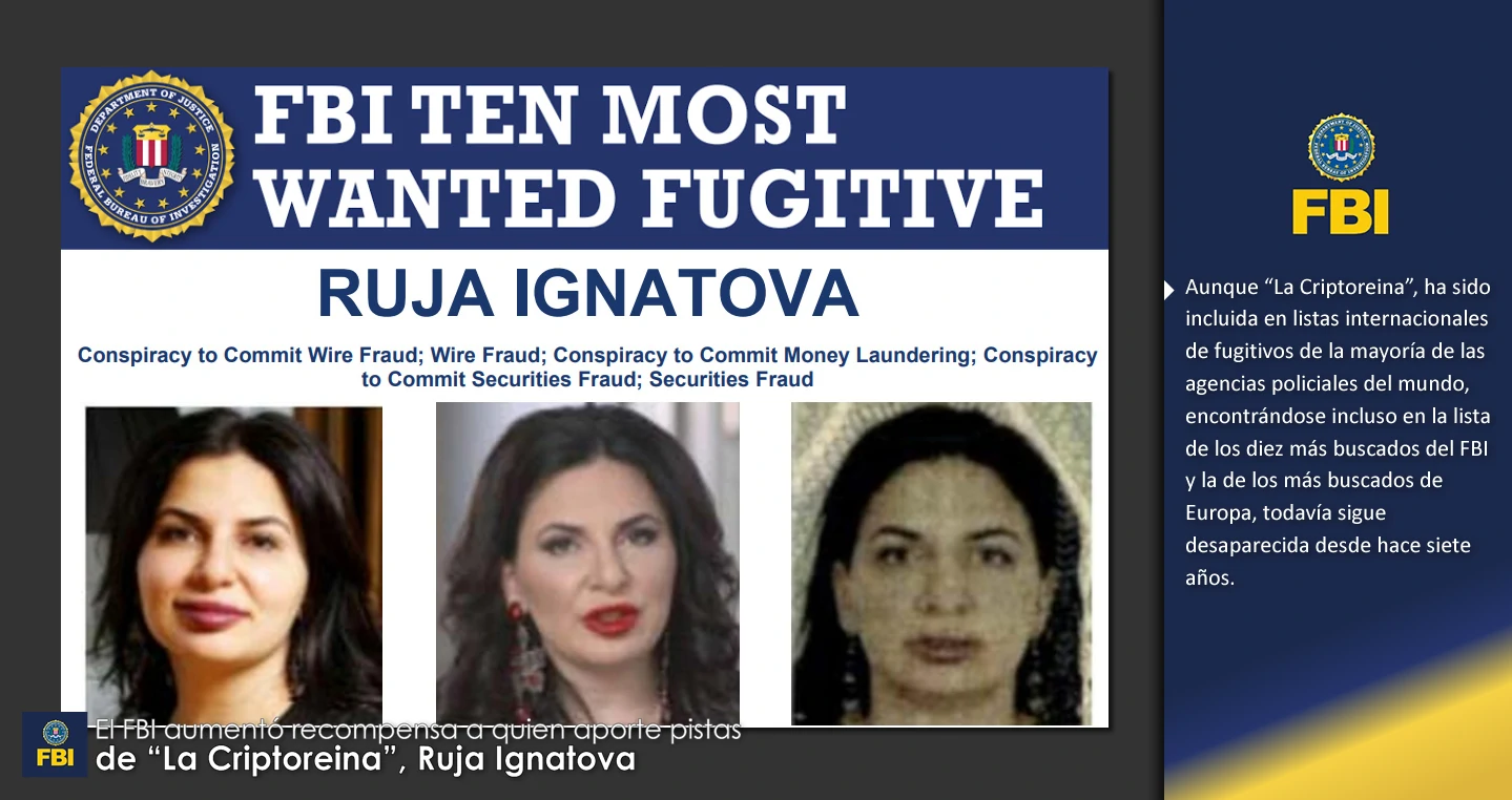 La semana pasada, el Buró Federal de Investigaciones de Estados Unidos (FBI, «por sus siglas en inglés»), en un comunicado informó que aumentó la recompensa hasta los cinco millones de dólares a quien proporcione pistas que lleven a la detención de Ruja Plamenova Ignatova, conocida como “La Criptoreina”.