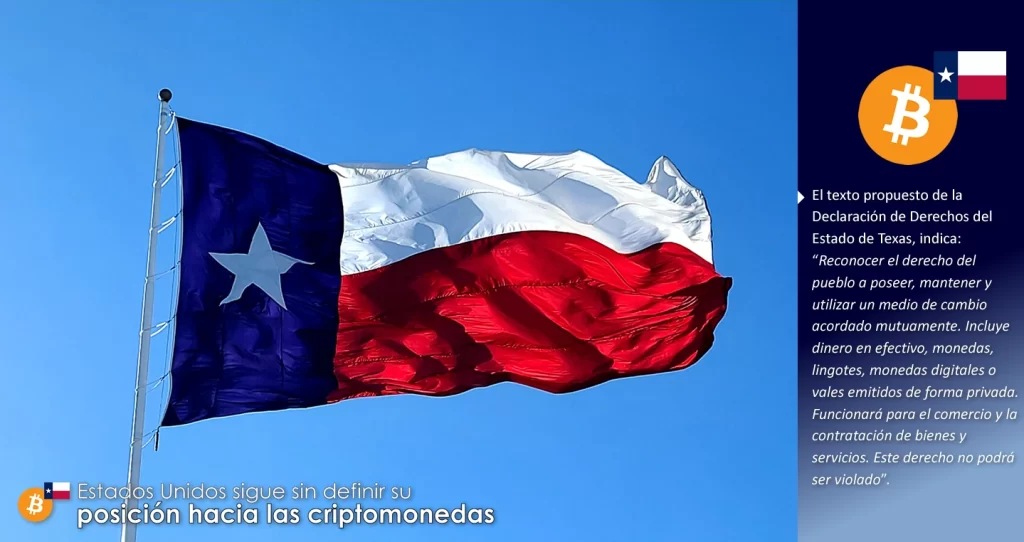 El texto propuesto de la Declaración de Derechos del Estado de Texas, indica: “Reconocer el derecho del pueblo a poseer, mantener y utilizar un medio de cambio acordado mutuamente. Incluye dinero en efectivo, monedas, lingotes, monedas digitales o vales emitidos de forma privada. Funcionará para el comercio y la contratación de bienes y servicios. Este derecho no podrá ser violado”.