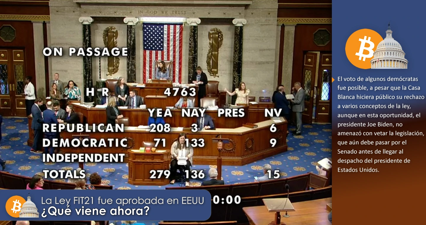 Este miércoles, la Cámara de Representantes de los Estados Unidos, votó a favor del proyecto Financial Innovation and Technology for the 21st Century Act (FIT21), “Ley de Innovación y Tecnología Financiera para el Siglo XXI”, creando un precedente histórico como la primera ley bipartidista votada por el Congreso que regulará el mercado de criptomonedas en ese país.