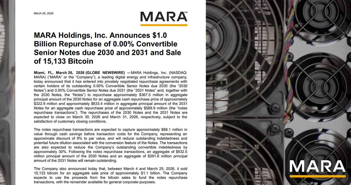 Today, MARA announced the repurchase of ~$1B in convertible notes at a ~9% discount to par value.