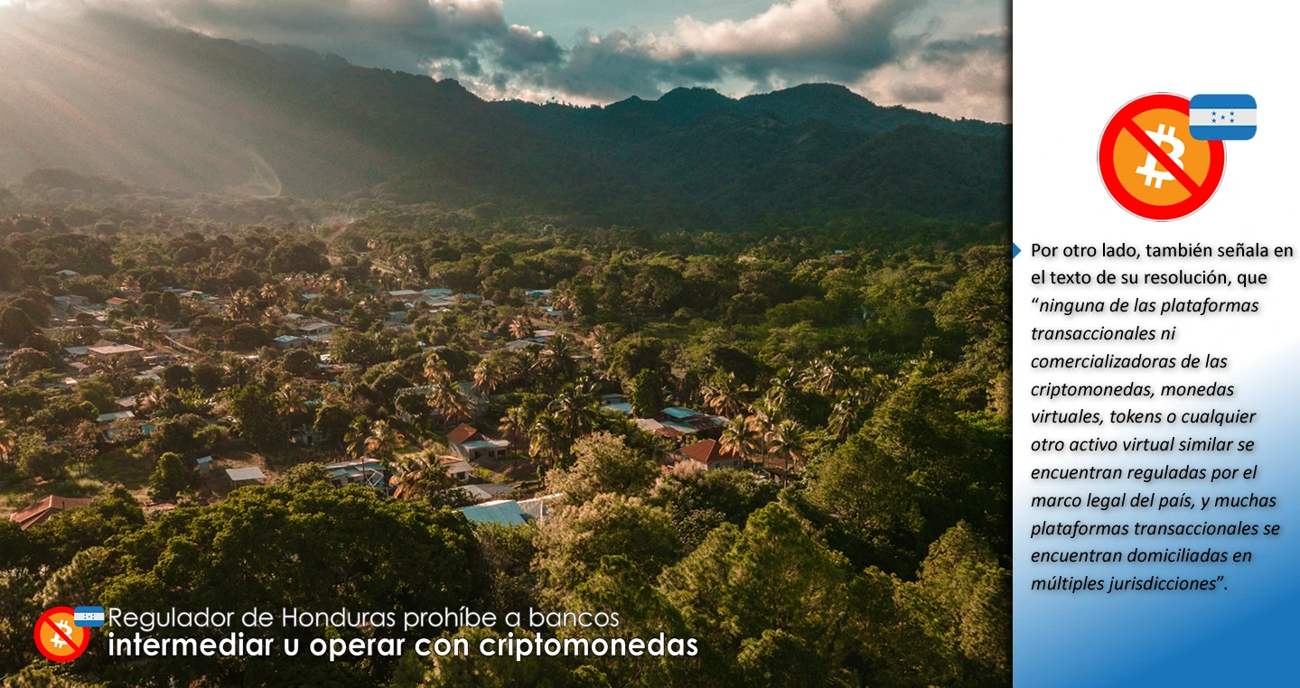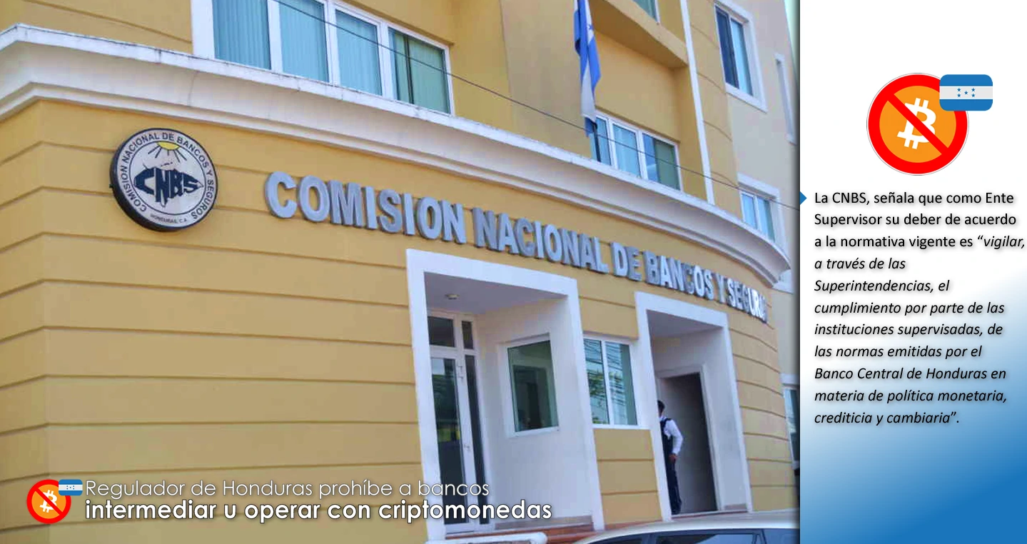El pasado lunes, la Comisión Nacional Bancaria y de Seguros de Honduras (CNBS) emitió una resolución que prohíbe a las instituciones financieras de ese país “mantener, invertir, intermediar u operar con criptomonedas, activos criptográficos, monedas virtuales, tokens o cualquier otro activo virtual similar”.